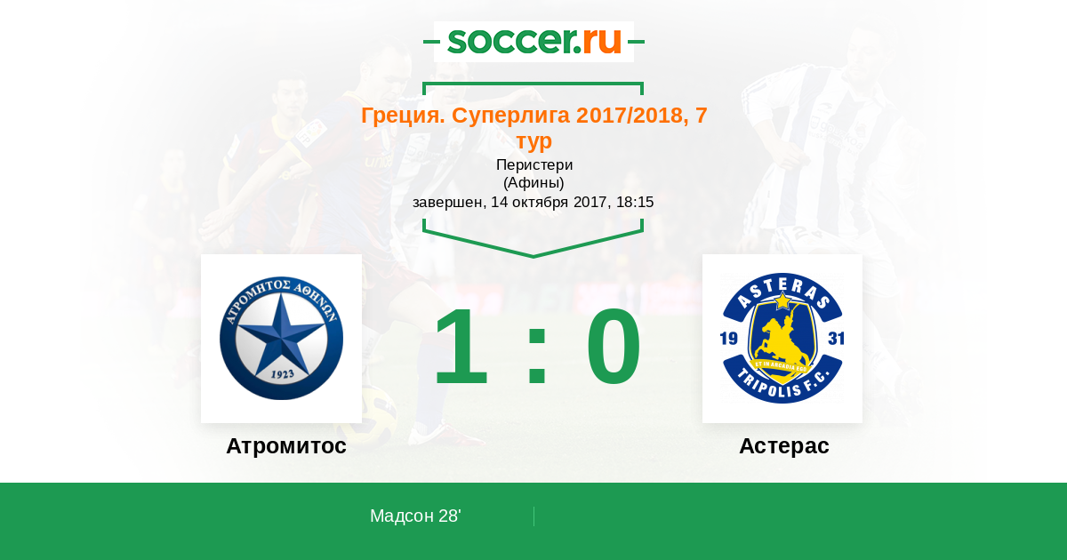 Греция. Суперлига 25.09.2016 Атромитос Логотип футбольный клуб Атромитос (Перистери) 1:0 Логотип футбольный клуб Астерас (Триполис) Астерас