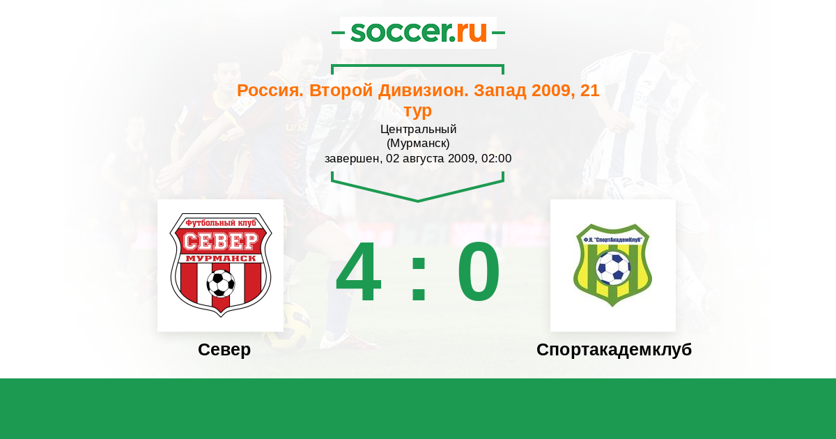 Россия. Вторая лига. Группа 2 19.09.2010 Север Логотип футбольный клуб Север (Мурманск) 6:3 Логотип футбольный клуб Спортакадемклуб (Москва) Спортакадемклуб