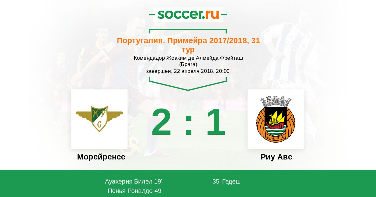 Португалия. Примейра 03.05.2019 Морейренcе Логотип футбольный клуб Морейренcе (Морейра-де-Конегуш) 1:2 Логотип футбольный клуб Риу Аве (Вила-ду-Конди) Риу Аве