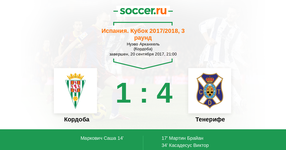 Испания. Сегунда 17.09.2017 Кордоба Логотип футбольный клуб Кордоба 2:0 Логотип футбольный клуб Тенерифе (Санта-Крус-де-Тенерифе) Тенерифе