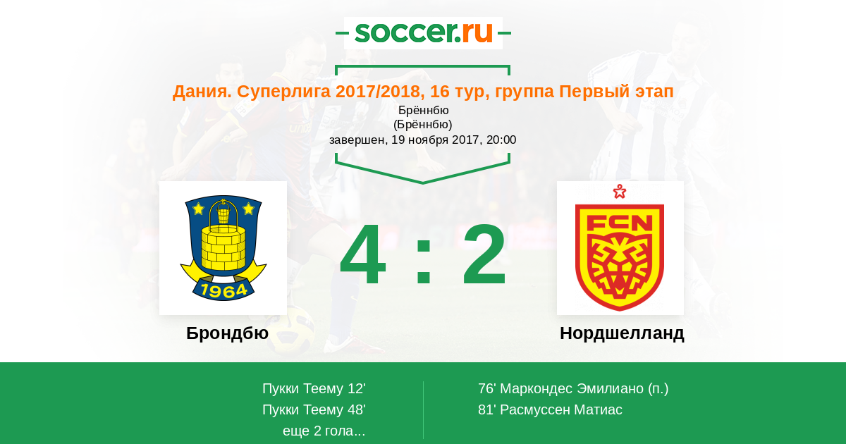 Дания. Суперлига 23.07.2017 Нордшелланд Логотип футбольный клуб Нордшелланд (Фарум) 3:2 Логотип футбольный клуб Брондбю (Брённбю) Брондбю