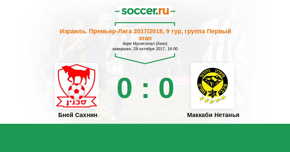 Израиль. Премьер-Лига 24.10.2015 Бней Сахнин Логотип Бней Сахнин 0:0 Логотип футбольный клуб Маккаби Нетанья Маккаби Нетанья