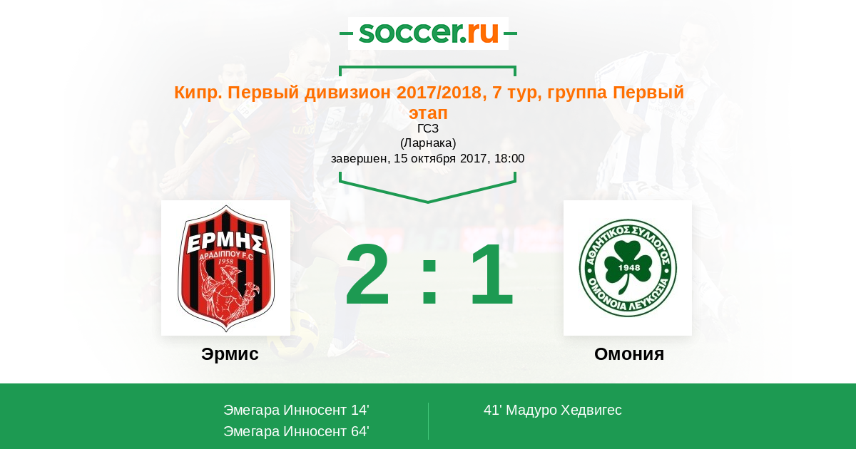Кипр. Первый Дивизион 18.10.2015 Эрмис Логотип футбольный клуб Эрмис (Арадиппу) 0:1 Логотип футбольный клуб Омония (Никосия) Омония