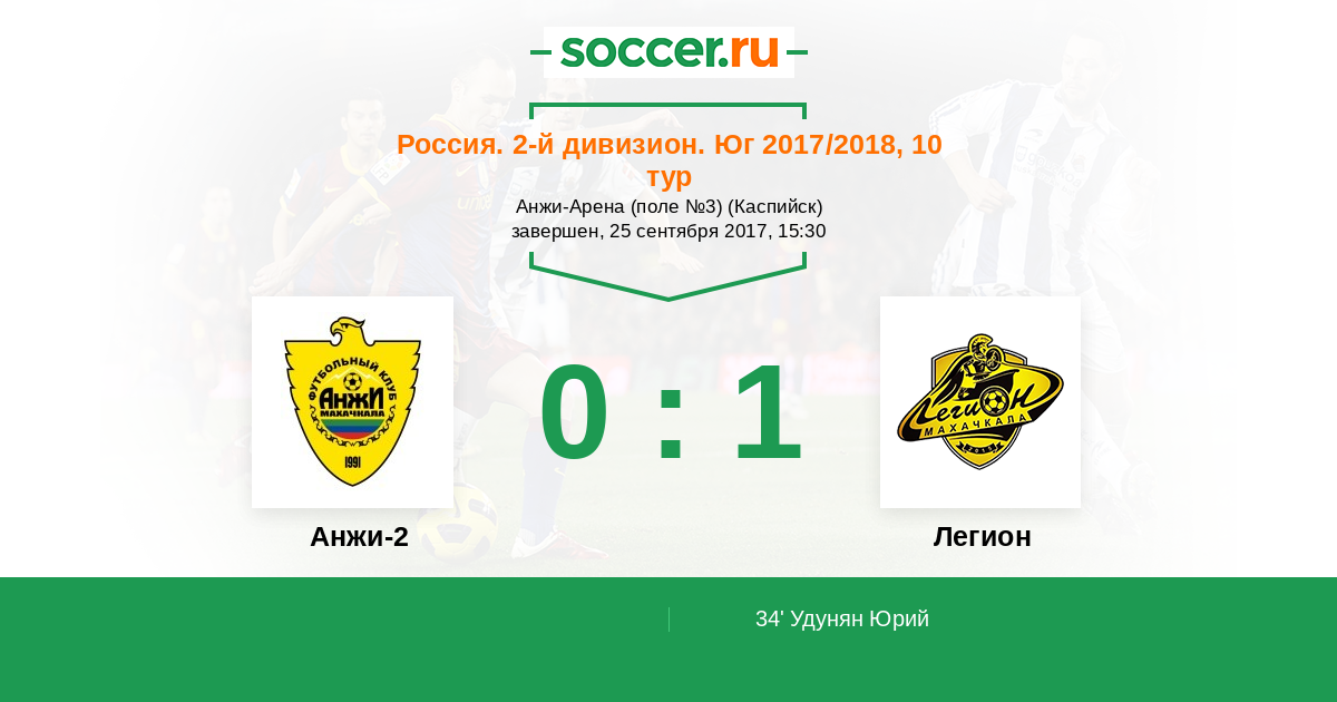 Россия. Вторая лига. Группа 1 08.04.2018 Легион Логотип футбольный клуб Легион (Махачкала) 3:0 Логотип футбольный клуб Анжи-2 (Махачкала) Анжи-2