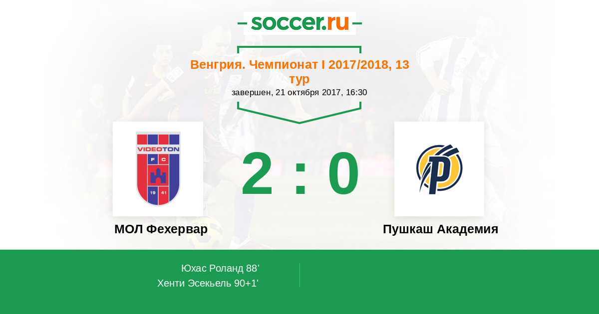 Венгрия. Чемпионат 1 15.09.2018 Пушкаш Академия Логотип футбольный клуб Пушкаш Академия (Фелксут) 2:1 Логотип футбольный клуб МОЛ Види (Секешфехервар) МОЛ Види