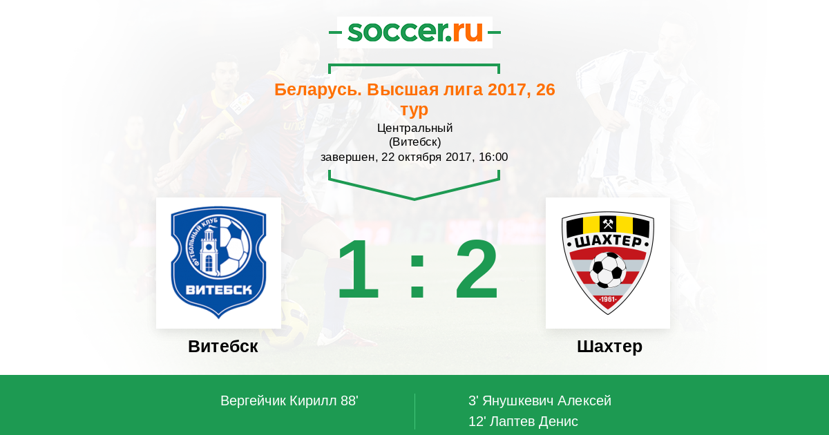 Беларусь. Высшая лига 25.09.2016 Шахтер Логотип футбольный клуб Шахтер (Солигорск) 1:0 Логотип футбольный клуб Витебск Витебск