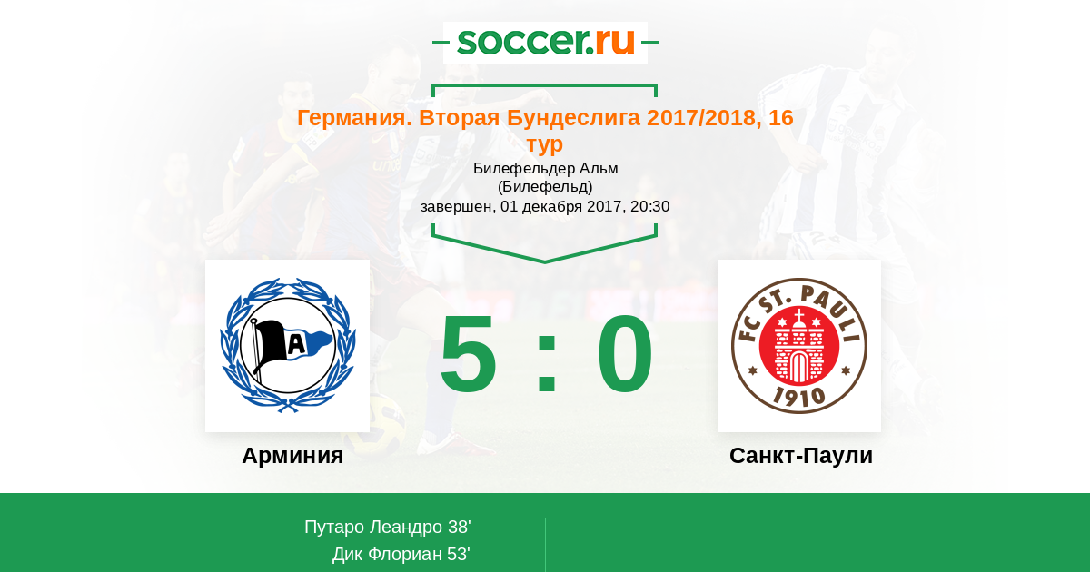 Германия. Бундеслига 2 19.02.2017 Арминия Логотип футбольный клуб Арминия (Билефельд) 1:1 Логотип футбольный клуб Санкт-Паули (Гамбург) Санкт-Паули