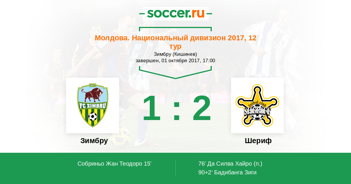 Молдова. Национальный дивизион 09.04.2017 Зимбру Логотип футбольный клуб Зимбру (Кишинев) 0:1 Логотип футбольный клуб Шериф (Тирасполь) Шериф