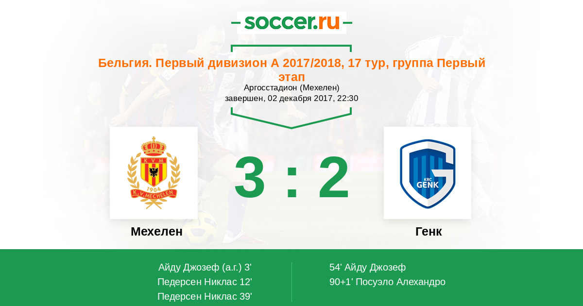 Бельгия. Про-Лига 26.08.2017 Генк Логотип футбольный клуб Генк 1:0 Логотип футбольный клуб Мехелен Мехелен