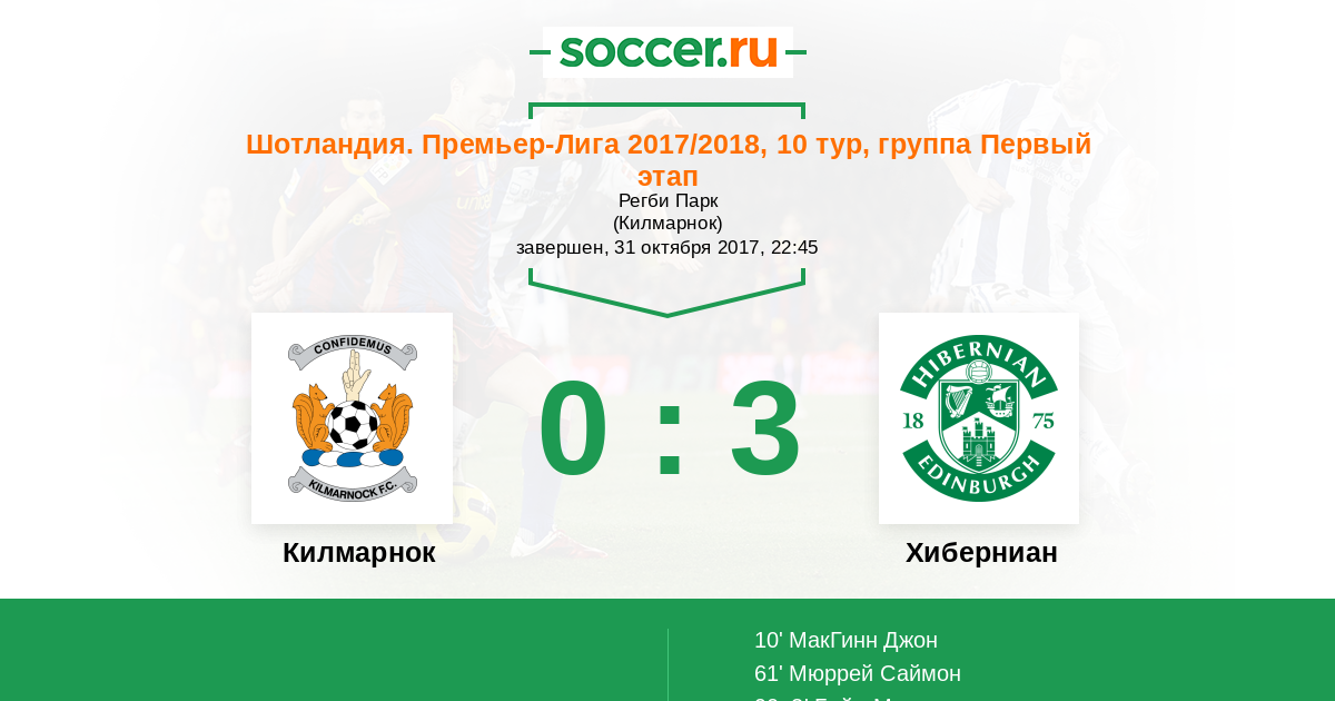 Шотландия. Премьер-Лига 16.10.2010 Хиберниан Логотип футбольный клуб Хиберниан (Эдинбург) 2:1 Логотип футбольный клуб Килмарнок Килмарнок