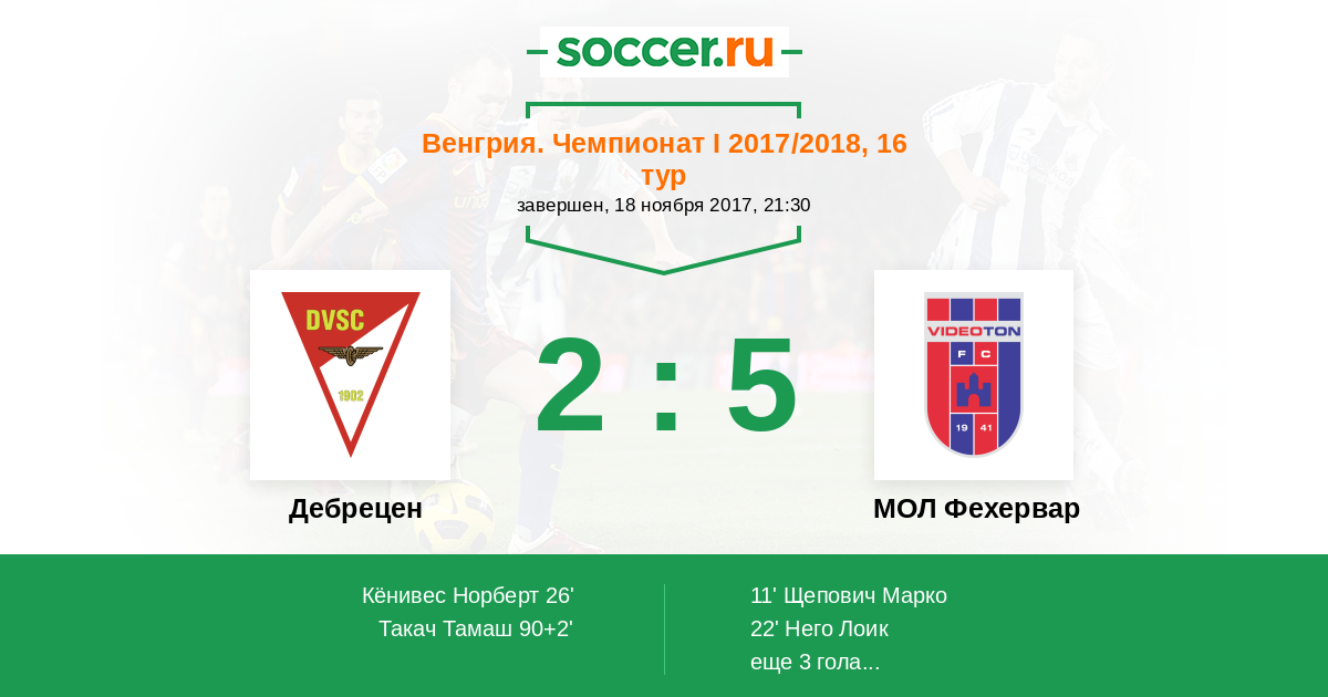 Венгрия. Чемпионат 1 29.04.2017 Видеотон Логотип футбольный клуб Видеотон (Секешфехервар) 3:2 Логотип футбольный клуб Дебрецен Дебрецен
