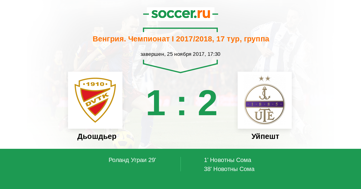 Венгрия. Чемпионат 1 19.08.2017 Уйпешт Логотип футбольный клуб Уйпешт (Будапешт) 1:1 Логотип футбольный клуб Дьошдьер (Мишкольц) Дьошдьер