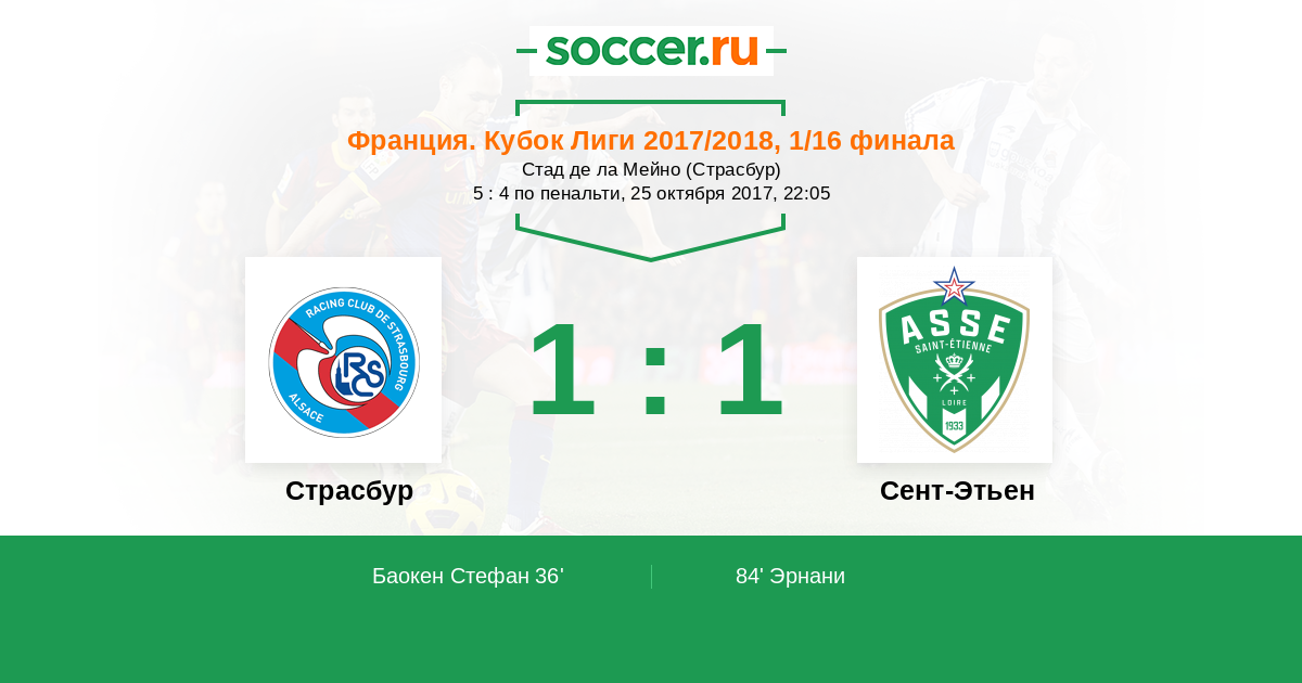 Франция. Лига 1 24.11.2017 Сент-Этьен Логотип футбольный клуб Сент-Этьен 2:2 Логотип футбольный клуб Страсбур Страсбур