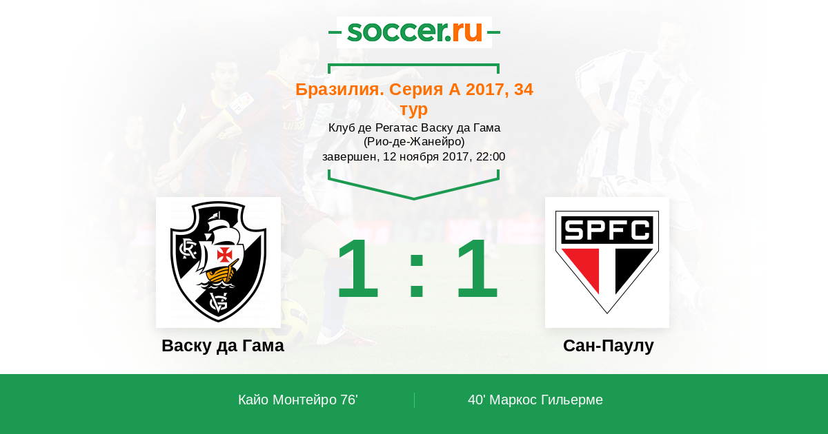 Бразилия. Серия А 20.07.2017 Сан-Паулу Логотип футбольный клуб Сан-Паулу 1:0 Логотип футбольный клуб Васку да Гама (Рио-де-Жанейро) Васку да Гама