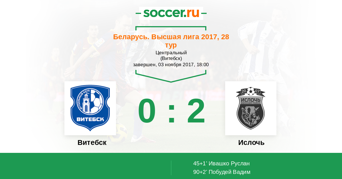 Беларусь. Первая лига 18.10.2014 Ислочь Логотип футбольный клуб Ислочь (Минск) 2:0 Логотип футбольный клуб Витебск Витебск