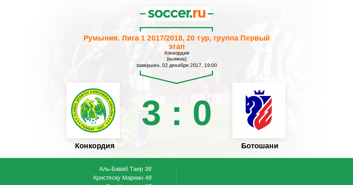 Румыния. Лига 1 01.12.2013 Ботошани Логотип футбольный клуб Ботошани 0:2 Логотип футбольный клуб Конкордия (Кяжна) Конкордия