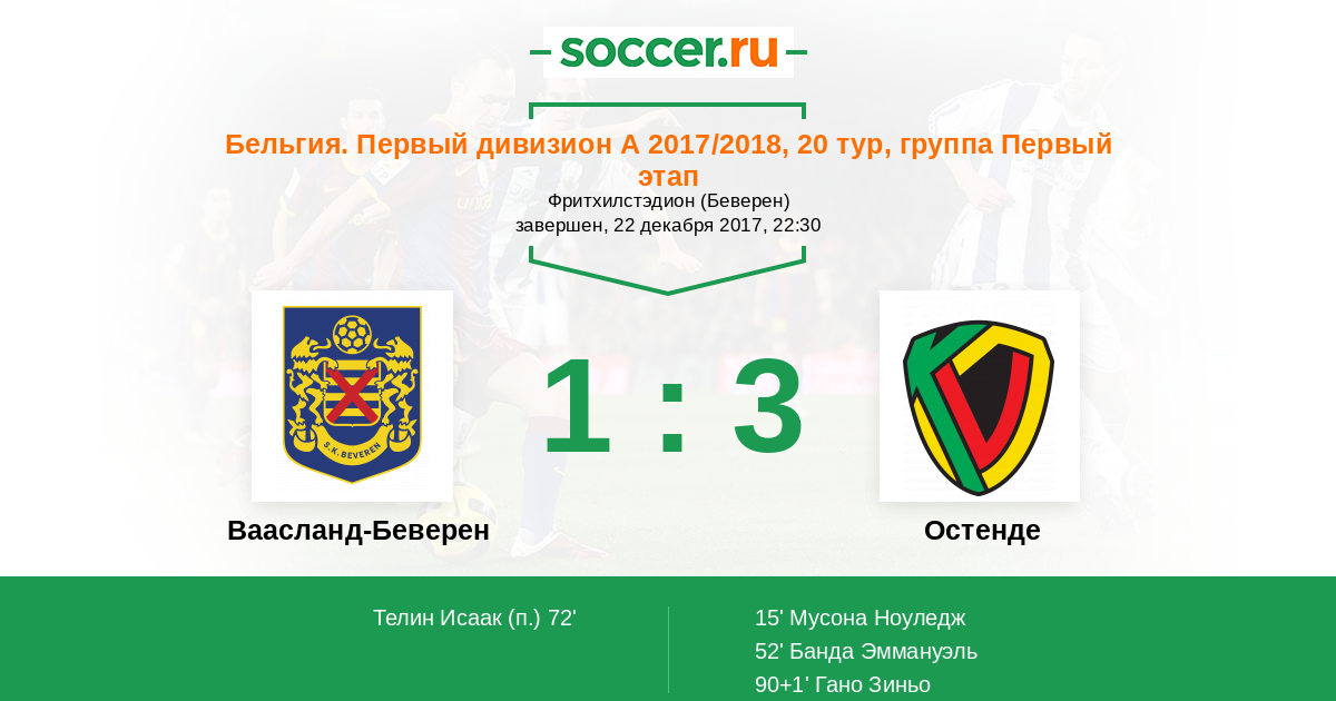 Бельгия. Про-Лига 21.01.2017 Ваасланд-Беверен Логотип футбольный клуб Ваасланд-Беверен 0:1 Логотип футбольный клуб Остенде Остенде