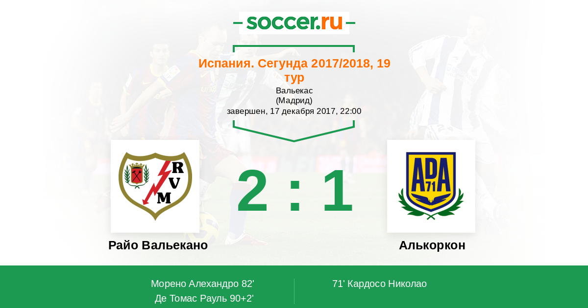 Испания. Сегунда Б: Группа 1 16.12.2007 Алькоркон Логотип футбольный клуб Алькоркон 0:0 Логотип футбольный клуб Райо Вальекано (Мадрид) Райо Вальекано