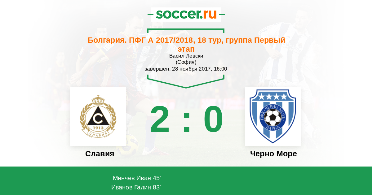 Болгария. Первая лига 20.04.2018 Черно Море Логотип футбольный клуб Черно Море (Варна) 2:0 Логотип футбольный клуб Славия (София) Славия