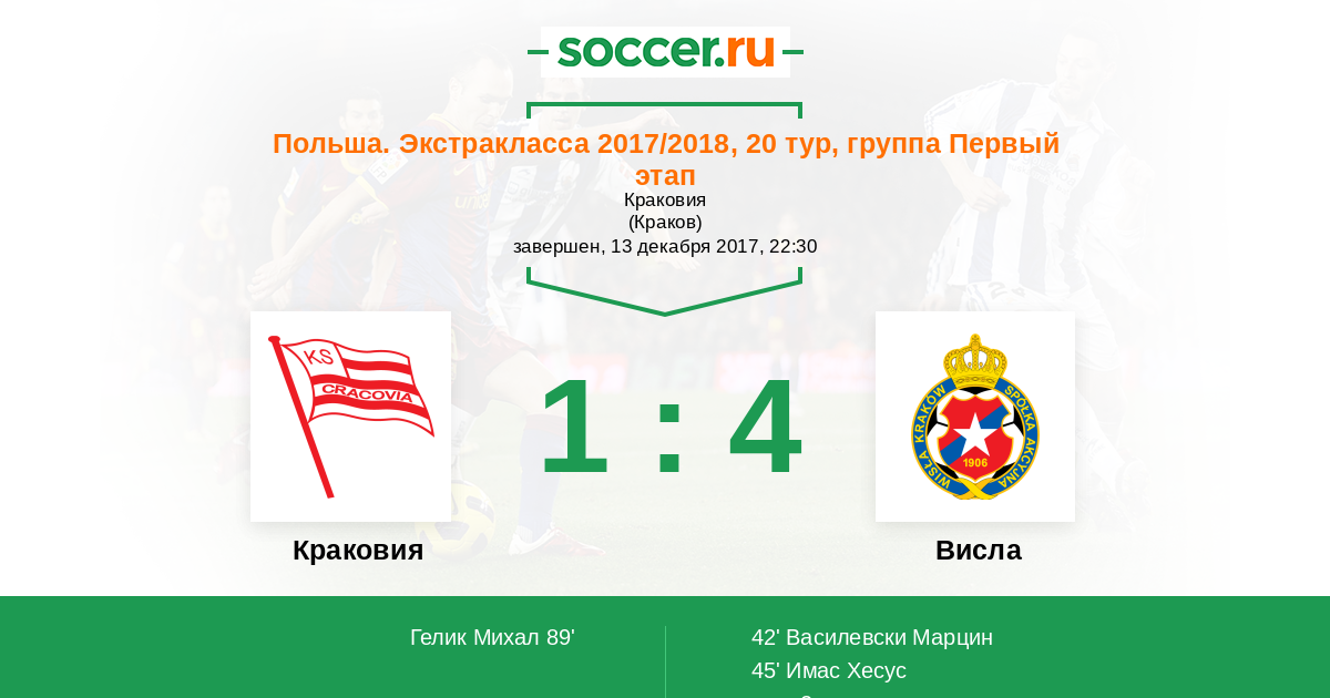 Польша. Экстракласса 12.08.2017 Висла Логотип футбольный клуб Висла (Краков) 2:1 Логотип футбольный клуб Краковия Краковия