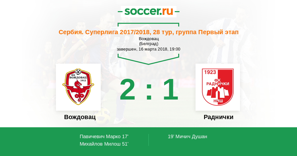 Сербия. Суперлига 25.02.2017 Раднички Логотип футбольный клуб Раднички (Ниш) 2:0 Логотип футбольный клуб Вождовац (Белград) Вождовац