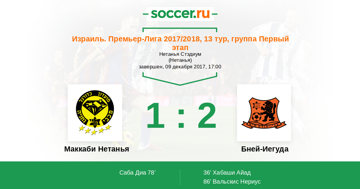 Израиль. Премьер-Лига 09.02.2013 Маккаби Нетанья Логотип футбольный клуб Маккаби Нетанья 3:5 Логотип футбольный клуб Бней-Иегуда (Тель-Авив) Бней-Иегуда