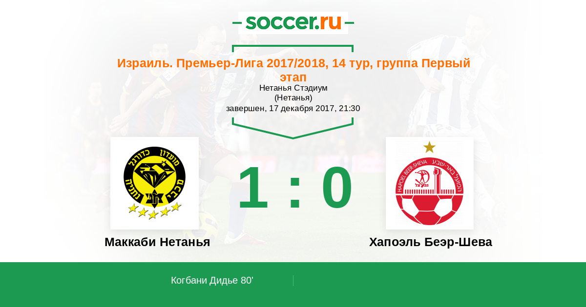 Израиль. Премьер-Лига 11.12.2010 Маккаби Нетанья Логотип футбольный клуб Маккаби Нетанья 1:0 Логотип футбольный клуб Хапоэль Беэр-Шева Хапоэль Беэр-Шева
