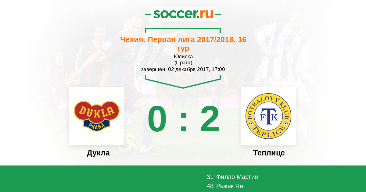 Чехия. Первая Лига 29.07.2016 Дукла Логотип футбольный клуб Дукла (Прага) 0:1 Логотип футбольный клуб Теплице Теплице