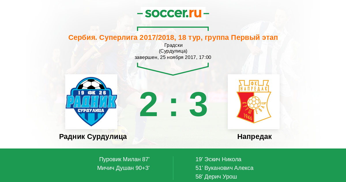 Сербия. Суперлига 04.08.2017 Напредак Логотип футбольный клуб Напредак (Крушевац) 1:2 Логотип футбольный клуб Радник Сурдулица Радник Сурдулица