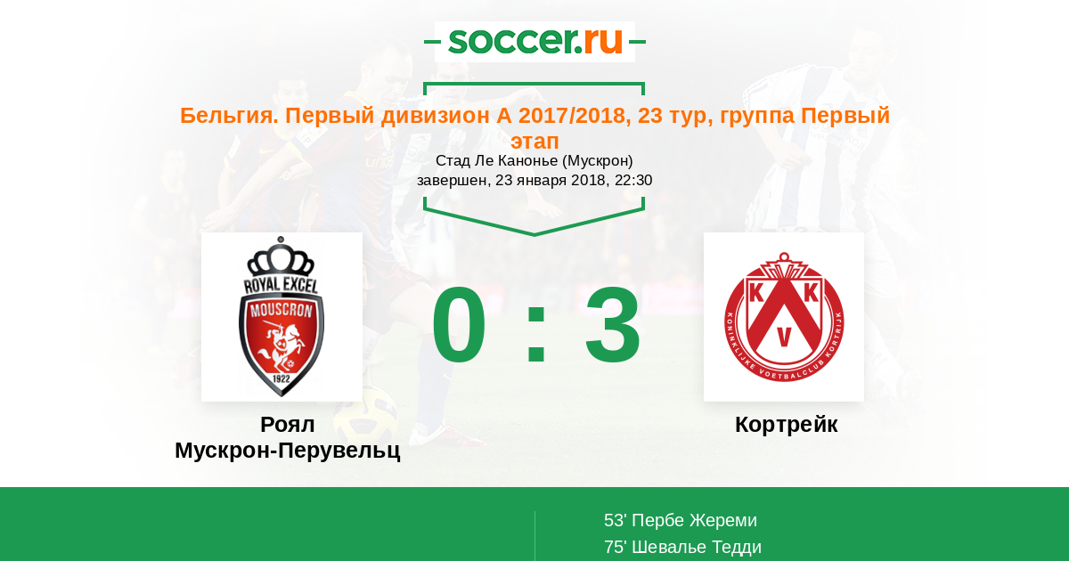 Бельгия. Про-Лига 01.04.2017 Кортрейк Логотип футбольный клуб Кортрейк 2:1 Логотип футбольный клуб Роял Мускрон-Перувельц Роял Мускрон-Перувельц
