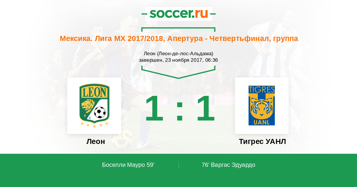 Мексика. Примера-Дивизион 26.11.2017 Тигрес УАНЛ Логотип футбольный клуб Тигрес УАНЛ (Монтеррей) 1:1 Логотип футбольный клуб Леон Леон