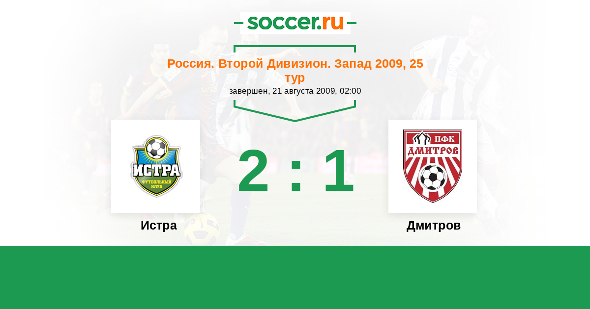 Россия. Вторая лига. Группа 2 23.09.2009 Дмитров Логотип футбольный клуб Дмитров 1:0 Логотип футбольный клуб Зеленоград (Москва) Зеленоград