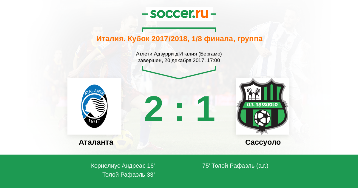 Италия. Серия А 10.09.2017 Аталанта Логотип футбольный клуб Аталанта (Бергамо) 2:1 Логотип футбольный клуб Сассуоло Сассуоло