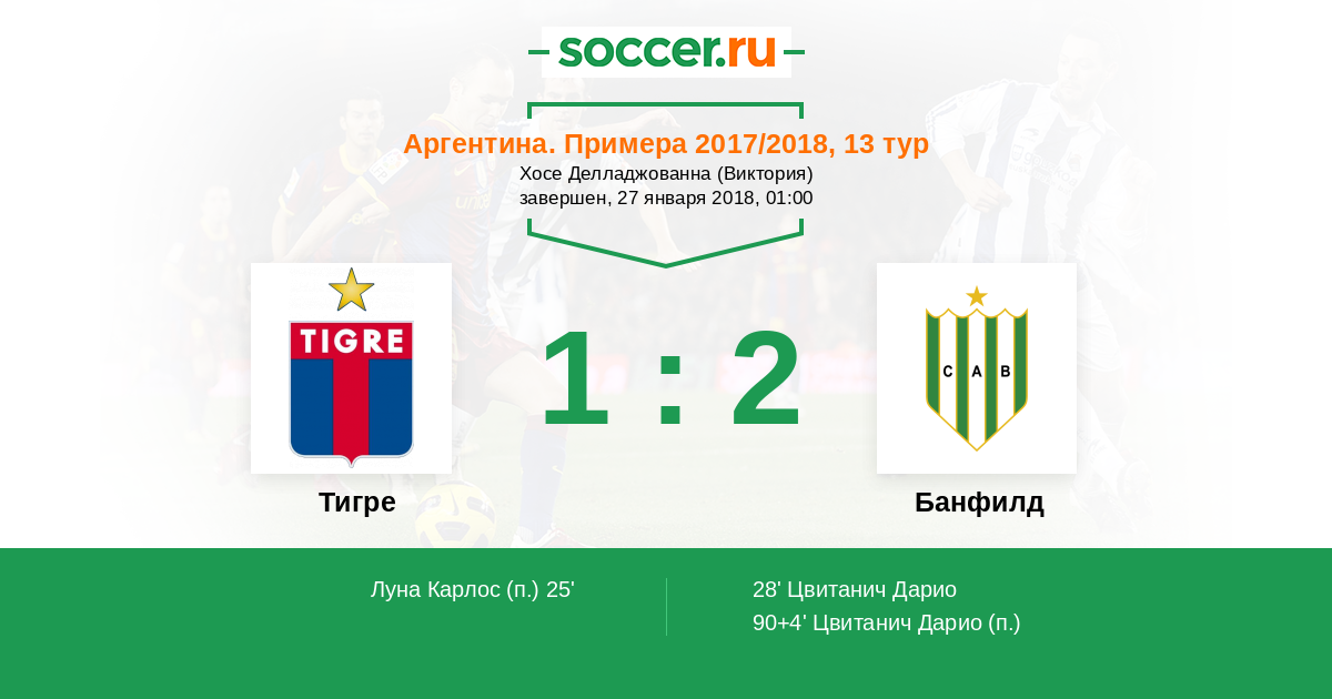 Аргентина. Суперлига 30.04.2017 Тигре Логотип футбольный клуб Тигре (Буэнос-Айрес) 0:1 Логотип футбольный клуб Банфилд Банфилд