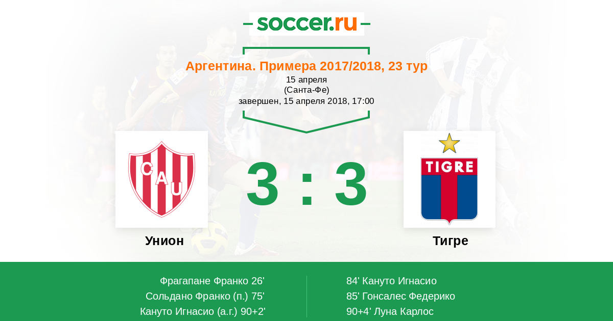 Аргентина. Суперлига 17.04.2016 Унион Логотип футбольный клуб Унион (Санта-Фе) 1:0 Логотип футбольный клуб Тигре (Буэнос-Айрес) Тигре