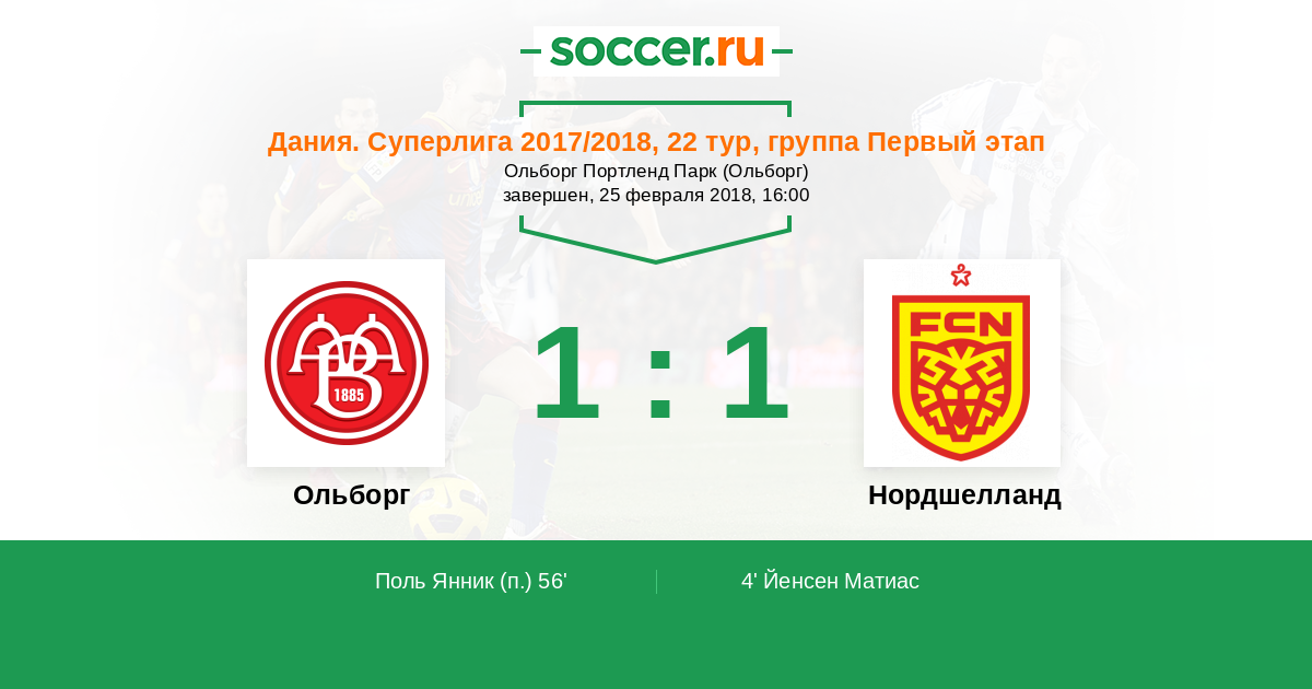 Дания. Суперлига 21.10.2016 Ольборг Логотип футбольный клуб Ольборг 1:1 Логотип футбольный клуб Нордшелланд (Фарум) Нордшелланд