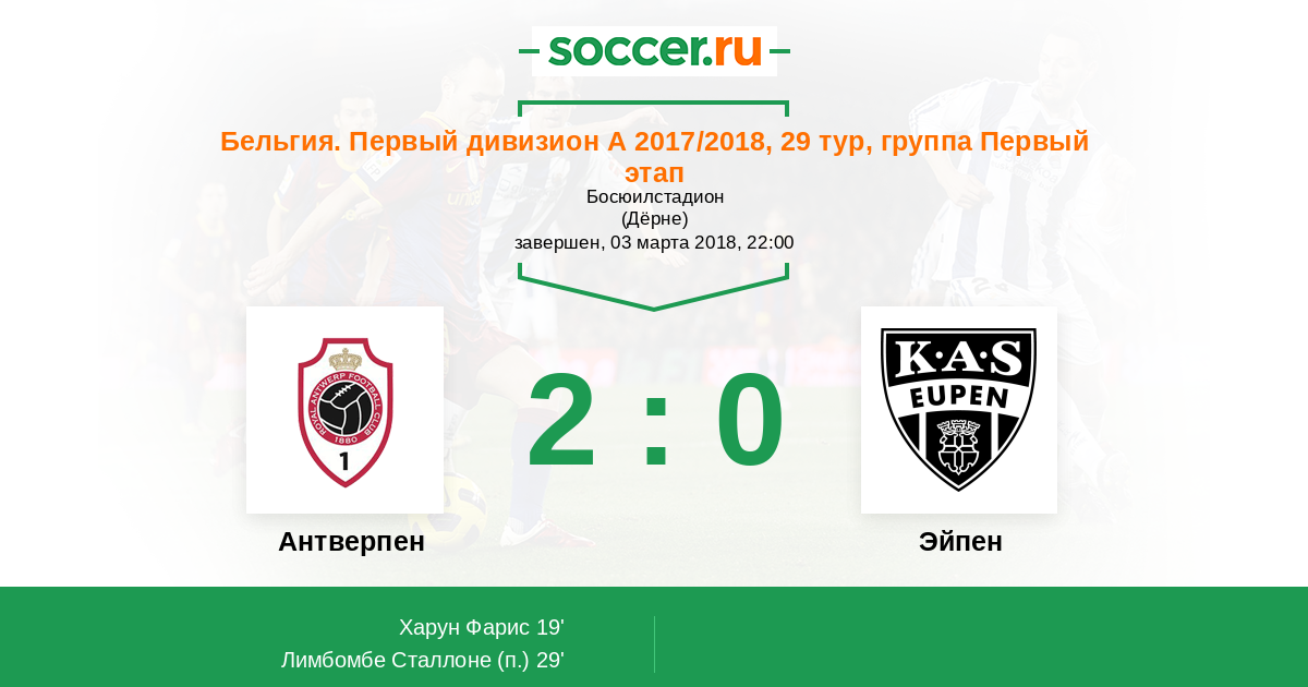 Бельгия. Про-Лига 03.03.2019 Антверпен Логотип футбольный клуб Антверпен 2:1 Логотип футбольный клуб Эйпен Эйпен