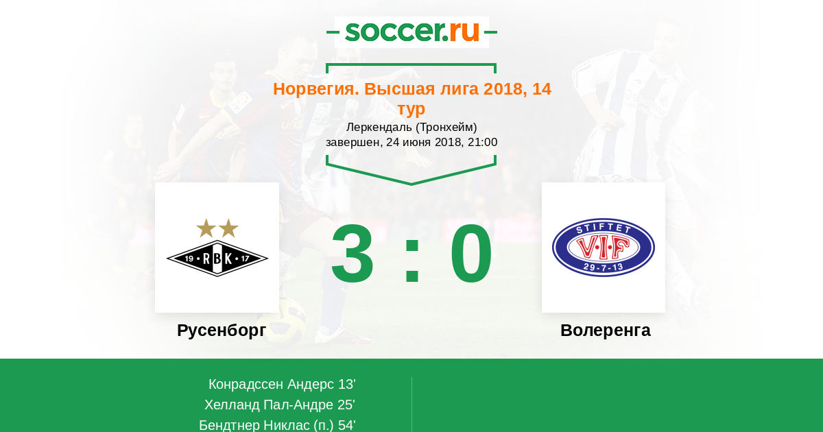 Норвегия. Высшая лига 16.06.2019 Русенборг Логотип футбольный клуб Русенборг (Тронхейм) 3:0 Логотип футбольный клуб Волеренга (Осло) Волеренга
