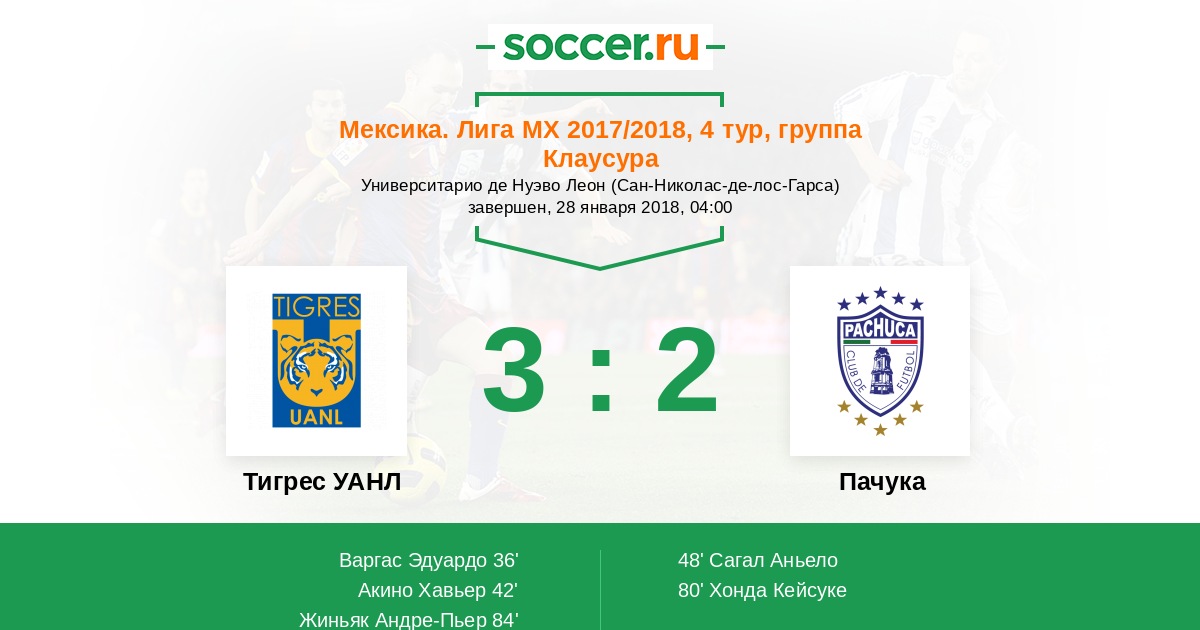 Мексика. Примера-Дивизион 13.08.2017 Пачука Логотип футбольный клуб Пачука 2:1 Логотип футбольный клуб Тигрес УАНЛ (Монтеррей) Тигрес УАНЛ