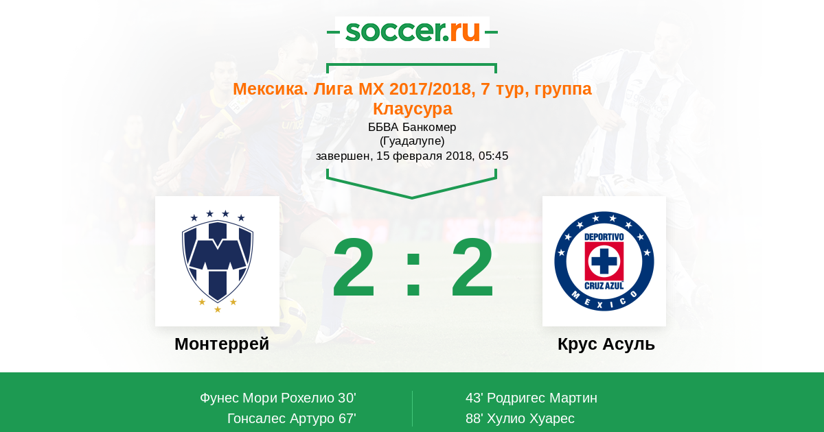 Мексика. Примера-Дивизион 06.12.2018 Монтеррей Логотип футбольный клуб Монтеррей 1:0 Логотип футбольный клуб Крус Асуль (Мехико) Крус Асуль