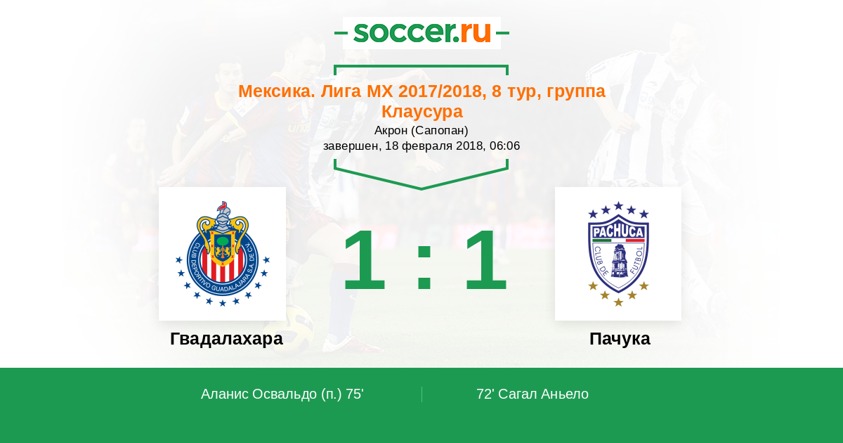 Мексика. Примера-Дивизион 16.04.2017 Пачука Логотип футбольный клуб Пачука 0:0 Логотип футбольный клуб Гвадалахара Гвадалахара