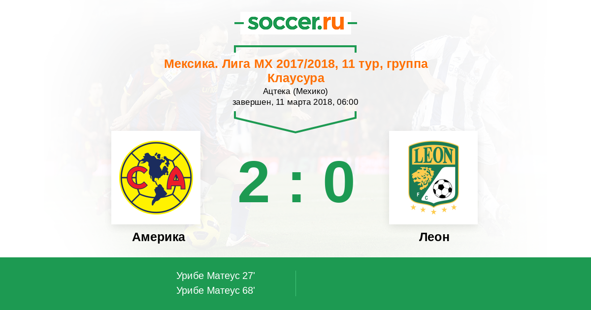 Мексика. Примера-Дивизион 23.08.2018 Леон Логотип футбольный клуб Леон 2:0 Логотип футбольный клуб Америка (Мехико) Америка