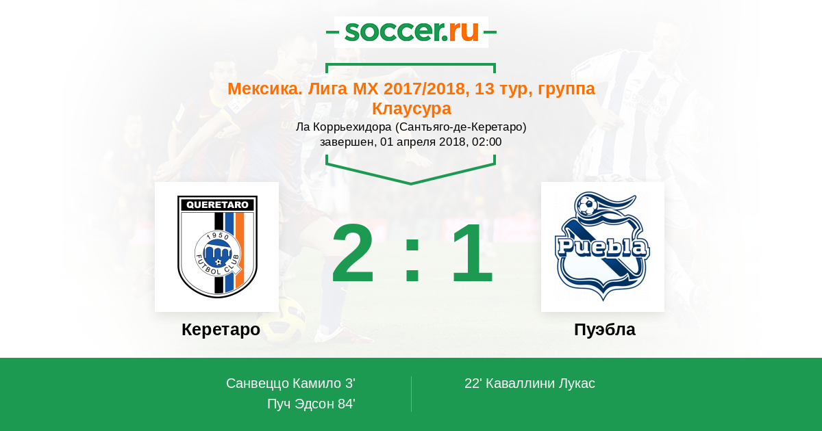 Мексика. Примера-Дивизион 14.10.2017 Пуэбла Логотип футбольный клуб Пуэбла (Пуэбла-де-Сарагоса) 2:2 Логотип футбольный клуб Керетаро (Сантьяго-де-Керетаро) Керетаро