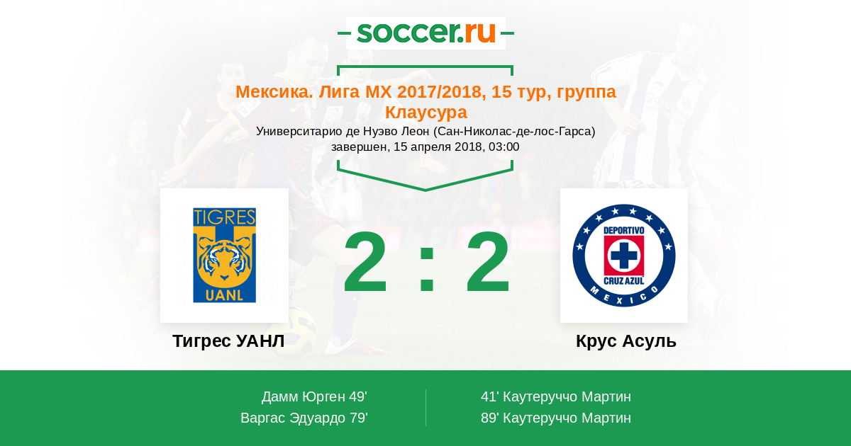Мексика. Примера-Дивизион 18.03.2017 Крус Асуль Логотип футбольный клуб Крус Асуль (Мехико) 0:0 Логотип футбольный клуб Тигрес УАНЛ (Монтеррей) Тигрес УАНЛ