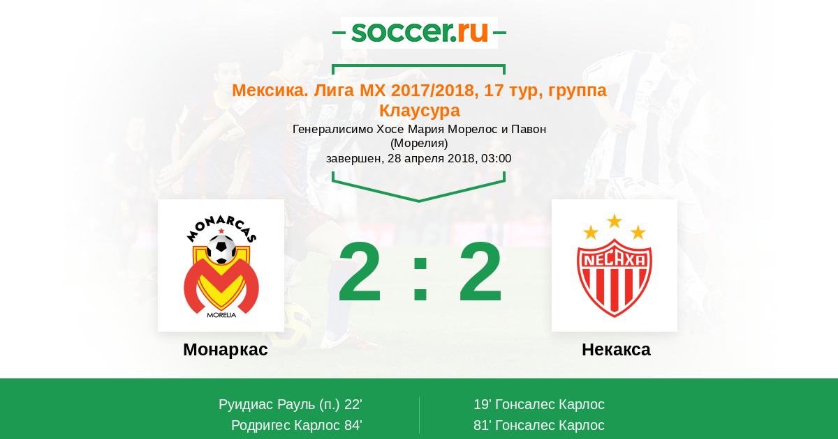Мексика. Примера-Дивизион 19.11.2017 Некакса Логотип футбольный клуб Некакса (Агуаскальентес) 1:2 Логотип футбольный клуб Монаркас (Морелия) Монаркас