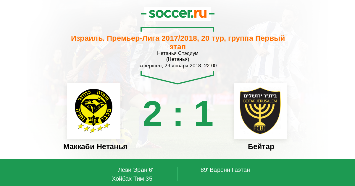 Израиль. Премьер-Лига 17.03.2018 Бейтар Логотип футбольный клуб Бейтар (Иерусалим) 2:0 Логотип футбольный клуб Маккаби Нетанья Маккаби Нетанья