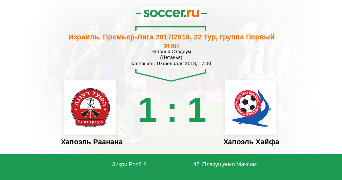 Израиль. Премьер-Лига 28.10.2017 Хапоэль Хайфа Логотип футбольный клуб Хапоэль Хайфа 2:0 Логотип футбольный клуб Хапоэль Раанана Хапоэль Раанана