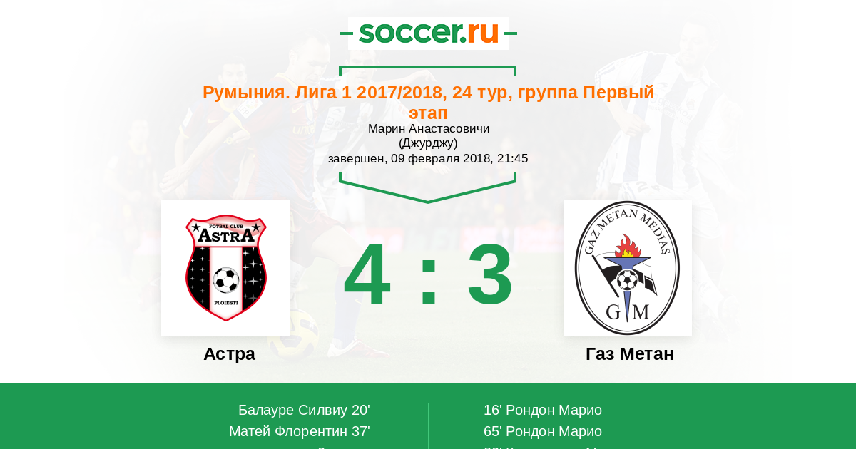 Румыния. Лига 1 24.09.2018 Астра Логотип футбольный клуб Астра (Джурджу) 3:0 Логотип футбольный клуб Газ Метан (Медиаш) Газ Метан