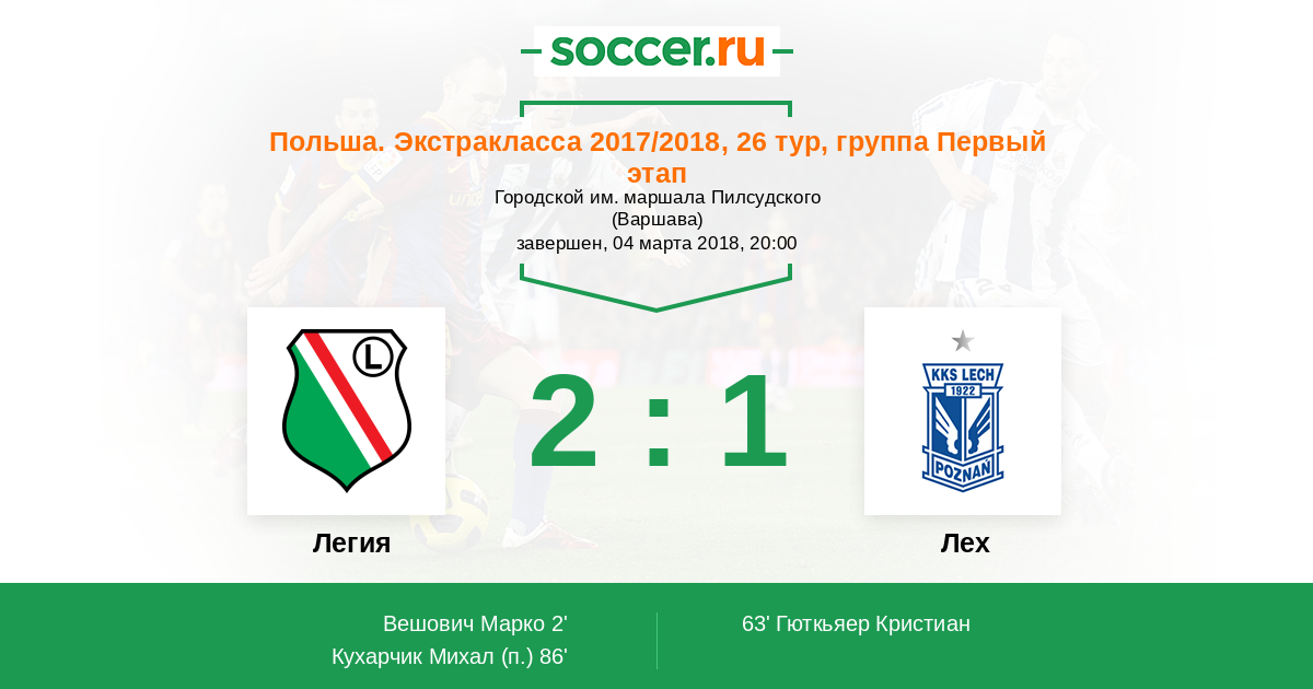 Польша. Экстракласса 17.05.2017 Легия Логотип футбольный клуб Легия (Варшава) 2:0 Логотип футбольный клуб Лех (Познань) Лех