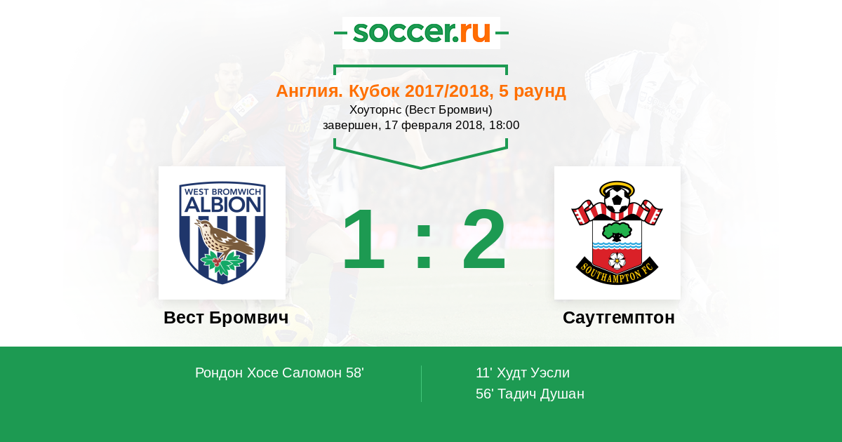 Англия. Премьер-Лига 03.02.2018 Вест Бромвич Логотип футбольный клуб Вест Бромвич 2:3 Логотип футбольный клуб Саутгемптон Саутгемптон